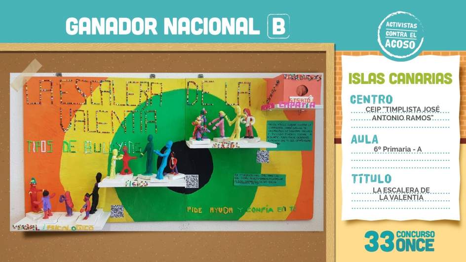 El CEIP Timplista José Antonio Ramos' de Las Palmas de Gran Canaria han ganado el 33 Concurso Escolar de la ONCE y su Fundación 'Somos diferentes, no indiferentes. Activistas contra el acoso', dentro de la categoría B (5º y 6º de Primaria).